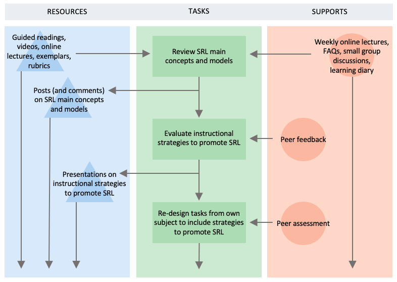 - Presentation on chosen instructional strategy to promote SRL: This would require them to conduct an investigation of potential strategies they would implement in their own subject, and putting together a presentation for their colleagues. Peer feedback on their presentations would be another opportunity for them to interact with their colleagues.
