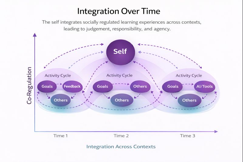 This view helps reconcile individual and social accounts of self-regulated learning. Regulation may be distributed across people and tools in the moment, but learning is integrated by the self across time — supporting continuity, agency, and becoming.